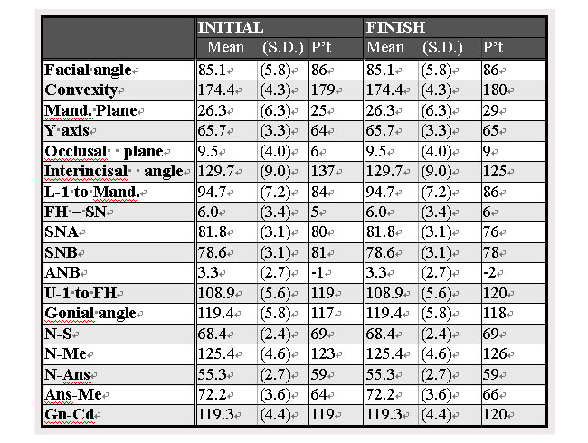 | Table ROENTGEN CEPHLOMETRIC ANALYSIS | ||||||||||||||