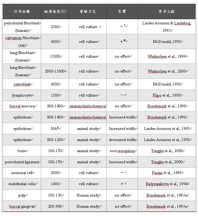 如表一所示,靜磁鐵對pulp、buccal gingival、buccal mucosa、osteoblast等口腔細胞或組織並沒有明顯的作用(McDonald, 1993; Bondemark et al. 1995a; Bondemark et al., 1998),而對於纖維母細胞影響的研究,則因不同的實驗室與實驗方法而有不同的結果。