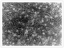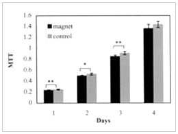(圖二)為纖維母細胞受磁場曝露與未受磁場曝露時,其MTT測試之結果,在四天的測試中,未受曝露的細胞均有較高的細胞活性,其中前三天有顯著的差異(p<0.05)或極顯著的差異(p<0.001)。此外,磁場曝露與未曝露組之MTT平均值差異於第1, 2, 3, 4天分別為0.015, 0.031, 0.063, 及0.074,亦有越來越大之趨勢。而在以4000高斯磁場強度作用於纖維母細胞之後,受曝露的細胞於第三天發生明顯的死亡現象,而未受磁場的細胞則狀況良好(如圖三)。