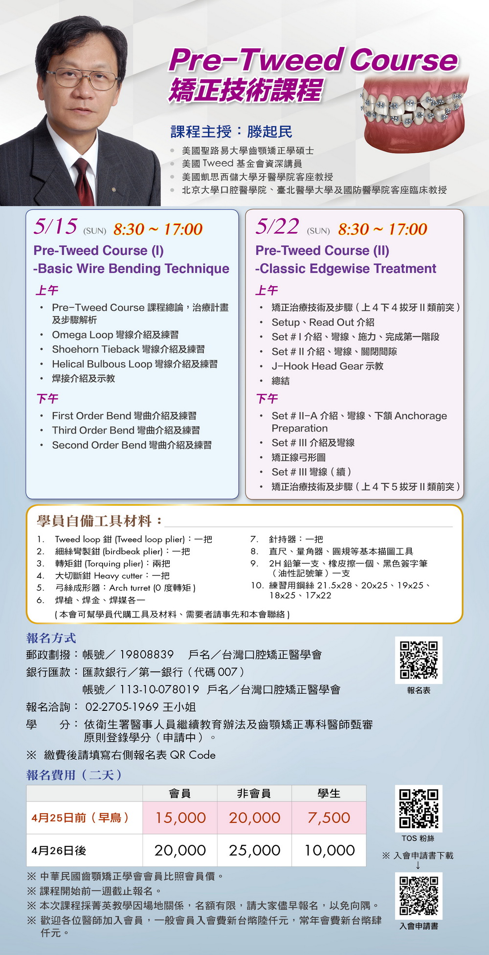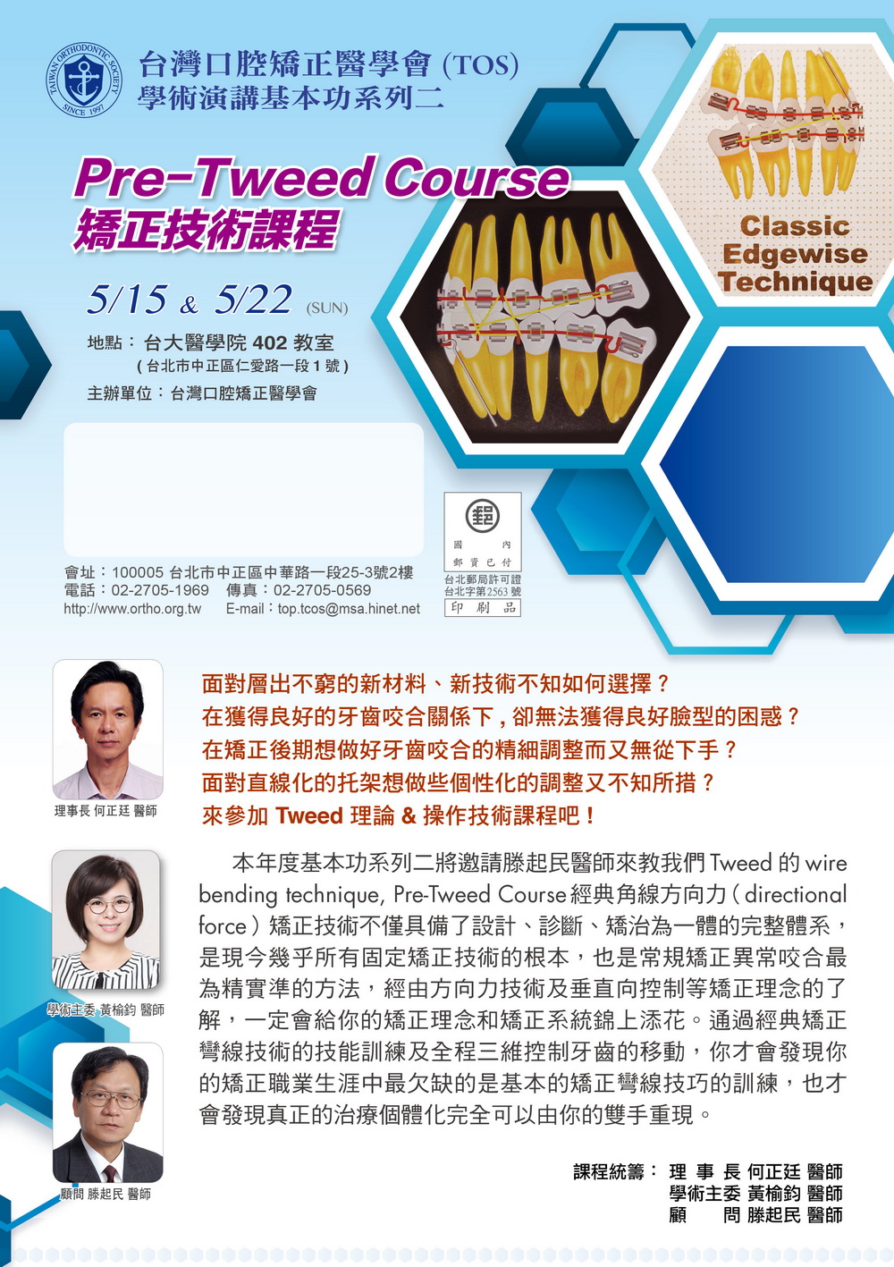 因應疫情升溫,原訂111年5月15.22日Pre-Tweed Course矯正技術課程,延期至8月7.21日台大醫學院402講堂舉行,造成不便,尚祈見諒。並敬祝平安,謝謝!