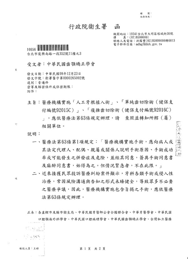 轉寄行政院衛生署來函